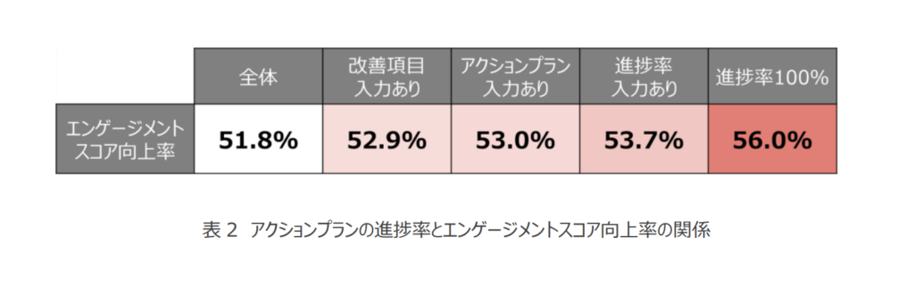 実際にモチベーションエンジニアリング研究所の調査によると、アクションプランを持続的に実践している企業ほど、従業員のエンゲージメントスコアが向上していることがわかりました。