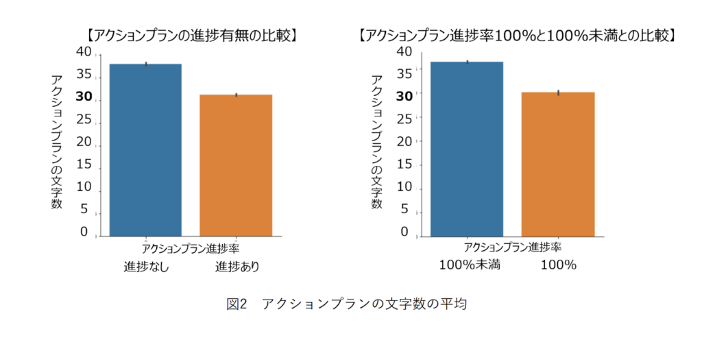 モチベーションエンジニアリング研究所の調査では、アクションプランの平均文字数が30文字程度と表現が端的な組織ほど、アクションプランの進捗率が高いことがわかりました。